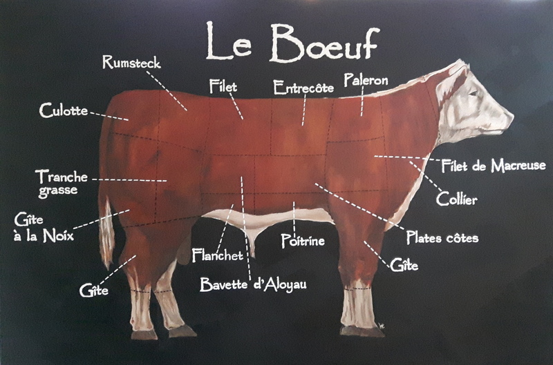 "Le Boeuf", een stier onderverdeeld in verschillende "vlees"delen. Een mooi doek om in een keuken, bij een slager of restaurant te hangen